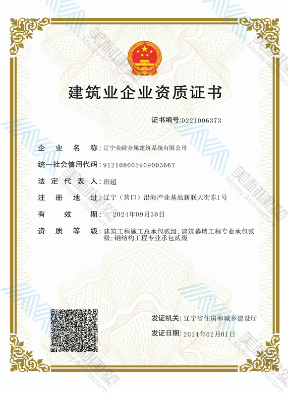 遼寧美耐金屬建筑系統(tǒng)有限公司位于遼寧(營口)沿海產(chǎn)業(yè)基地,專注于預制金屬建筑系統(tǒng)領域,是一家集工業(yè)建筑設計、制作、施工及相關的技術(shù)咨詢與服務為一體的綜合性服務企業(yè)。作為國家鋼結(jié)構(gòu)協(xié)會會員、中國建筑金屬結(jié)構(gòu)協(xié)會會員單位與國家高新技術(shù)企業(yè),美耐建筑集建筑工程施工總承包、鋼結(jié)構(gòu)工程專業(yè)承包等多種資質(zhì)于一身,并擁有22項鋼結(jié)構(gòu)建筑領域?qū)@?項軟件著作權(quán)。